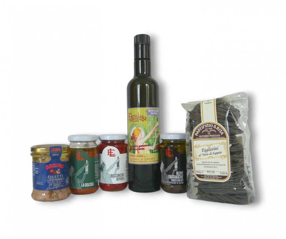 Cesto regalo per gli amanti del mare. Con Taglierini al Nero di Seppia, Tonno Auriga all'olio di oliva , Bocconcini sott'olio (peperoncini piccanti farciti con olive Taggiasche snocciolate e filetti di acciuga), Olio Extra Vergine Monocultivar Taggiasca, Salsa Golosa e Olive Taggiasche snocciolate sott'olio.