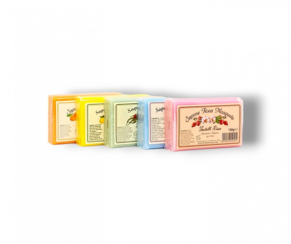 Cinque saponette dalle profumazioni fresche: Rosa Mosqueta, Lavanda, Aloe, Limone e Mandarino.